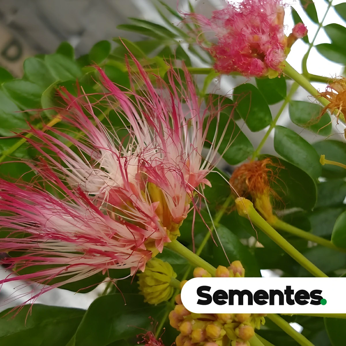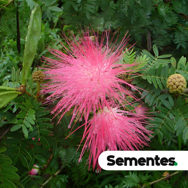 As flores são de uma beleza etérea e exótica. Elas se agrupam em inflorescências do tipo capítulo, que são cabeças globosas que se assemelham a um “pompom” ou a um “pincel de seda”. A beleza da inflorescência reside nos estames, que são muito longos, numerosos e bicolores: a metade inferior é de um branco-creme, e a metade superior é de um rosa-vivo ou carmesim. Estes pompons bicolores surgem em profusão sobre a folhagem verde-escura, criando um efeito visual deslumbrante. A floração ocorre geralmente na primavera e no verão.