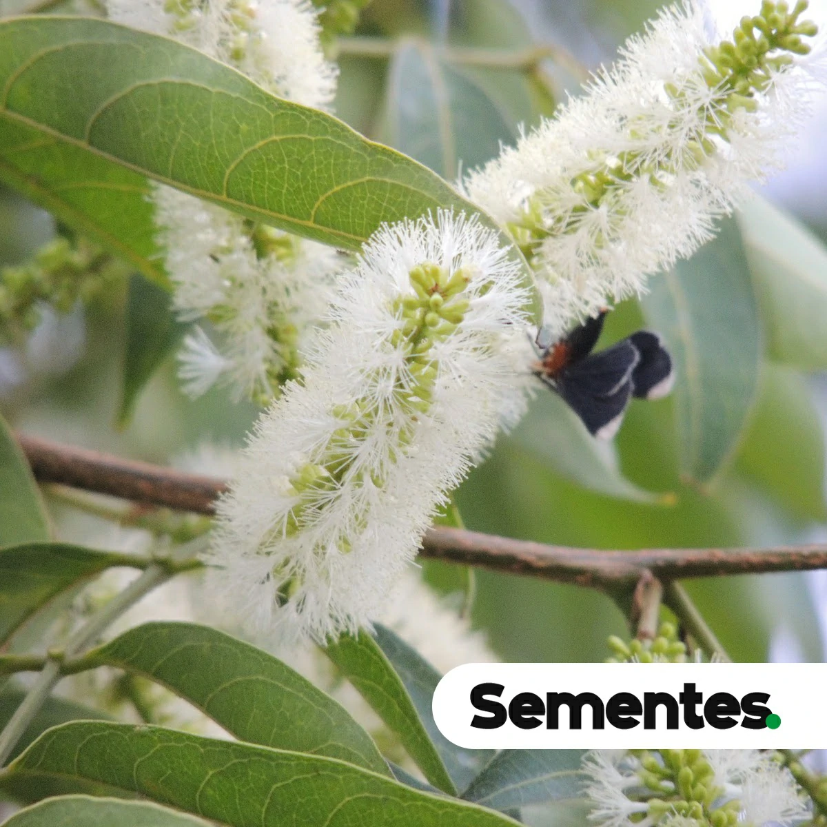 As flores são de uma beleza etérea e delicada. Elas se agrupam em inflorescências do tipo espiga, que se assemelham a um “pompom” ou a um pincel de barba. A beleza da flor não está nas pétalas, que são minúsculas e esverdeadas, mas sim nos numerosos e longos estames brancos, que se projetam para fora e criam este efeito de explosão de fios de seda. As flores são perfumadas, especialmente à noite, e sua floração é um evento que atrai uma grande variedade de polinizadores.