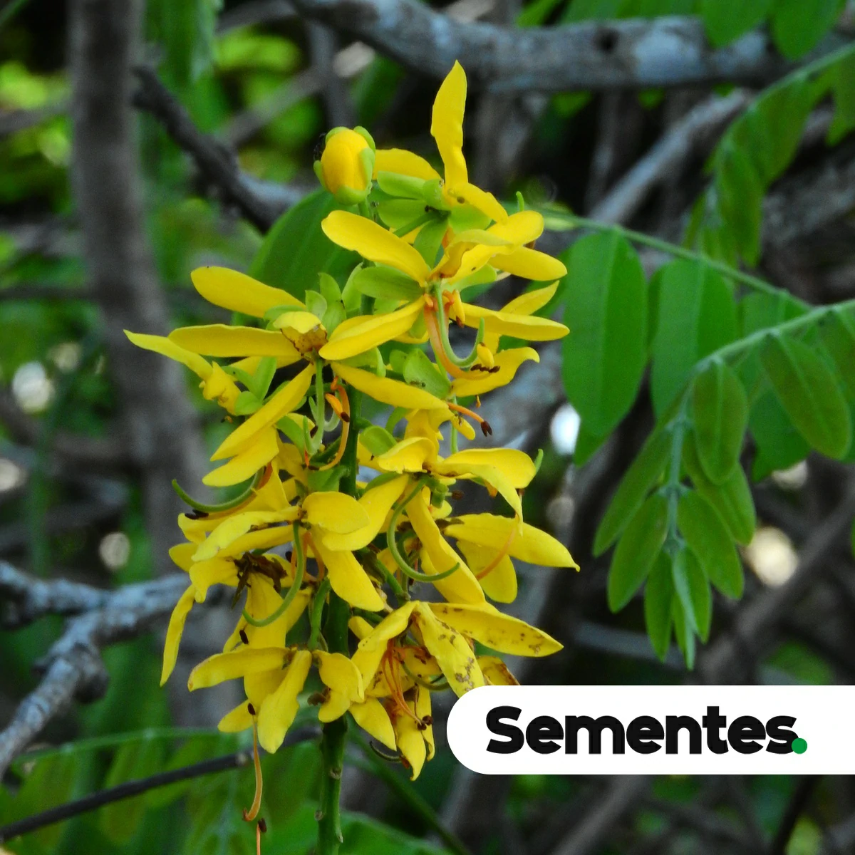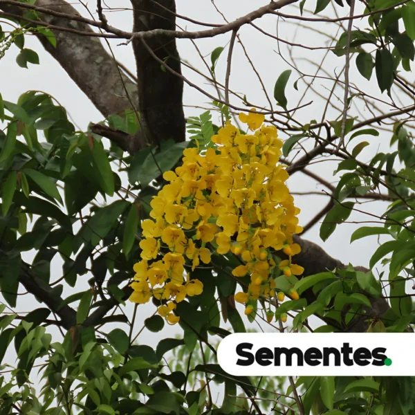 As folhas são compostas paripenadas, ou seja, formadas por 6 a 12 pares de folíolos de formato oblongo-elíptico, dispostos de forma simétrica ao longo de um eixo central. Os folíolos são de um verde-vivo, o que confere à copa uma aparência luxuriante. A floração é o evento que transforma a árvore em um monumento dourado. Geralmente na estação seca, a árvore se cobre de grandes inflorescências do tipo racemo (cachos), que surgem nas axilas das folhas. As flores são grandes, com pétalas de um amarelo-ouro intenso e brilhante. A estrutura da flor é fascinante e uma marca do gênero. Ela possui dez estames, mas eles não são todos iguais. Existem sete estames menores e férteis, e três estames maiores, estéreis e com um formato sigmoide (em forma de “S”), que funcionam como uma plataforma de pouso e um guia para os polinizadores. Esta complexa arquitetura floral é uma estratégia para garantir uma polinização eficiente. A visão de uma *Cassia leiandra* em plena floração, com seus cachos de flores amarelas pendendo dos galhos, é uma das mais belas cenas que as matas ciliares podem oferecer. Após a polinização, formam-se os frutos, que são vagens longas, cilíndricas, lenhosas e de cor escura, que podem medir de 20 a 40 cm de comprimento. Dentro das vagens, as sementes são dispostas em compartimentos individuais, separadas por septos.
